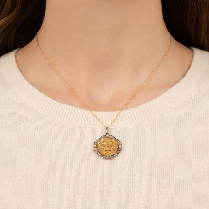 A precious Edwardian platinum over 18 karat yellow gold antique charm centered with a gold medallion of two angels blessing a baby. The medallion is surrounded by tiny rose cut diamonds and four natural seed pearls. A treasured gift.
