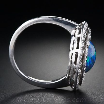 A beautiful original Edwardian platinum ring highlighting a 2.25 carat oval black opal cabochon dancing with blue and green play of color and wrapped in a double border of bead-set European-cut diamonds (1.75 carats total weight, F-H color, VS-SI clarity). Currently size 6 1/2.