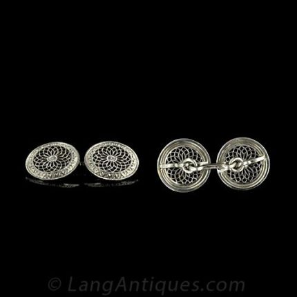 A geometric spirograph design rendered in delicate openwork distinguish these double-sided cufflinks from the early 20th century. 14 karat white gold.