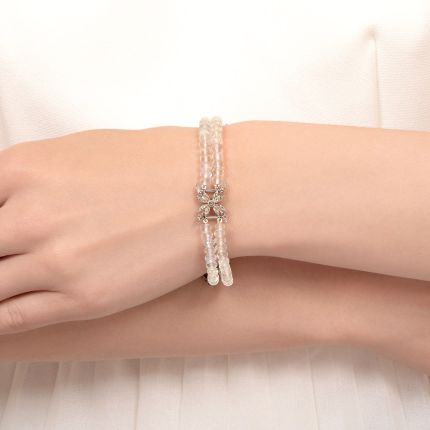 Here's a jewel with an intriguing composition. Clearly Edwardian in style, it does feature three lovely leaf-like links that glitter with tiny rose cut diamonds, the third of which performs double duty as the clasp. Here's the twist, where one would normally expect to find natural pearls, this enchanting bracelet presents shimmering double strands of contemporary faceted moonstone beads (added at a much later date most likely to replace pearls) infused with silver-blue highlights. A marvelous marriage of past and present. Hand fabricated in platinum, circa 1910. 7 1/4 inches long by 1/2 inch wide. Total diamond weight - .45 carat, total moonstone weight - 28.00 carats.