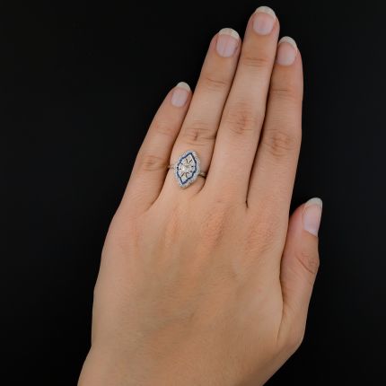 Few original Edwardian/early-Art Deco delicacies come as fine and fabulous as this navette-shaped dinner ring hand fabricated in platinum over 14K yellow gold during the first or second decade of the twentieth century. A central bezel-set European-cut diamond is elegantly framed with tiny glittering single-cut and rose-cut diamonds and a curvaceous outline of tiny bright royal blue calibre sapphires. Decorative piercing, diamond-set shoulders, chenier tubing along the side gallery, and an embossed upper ring shank add the finishing touches to this exquisite antique jewel. 11/16-inch long. Currently ring size 6