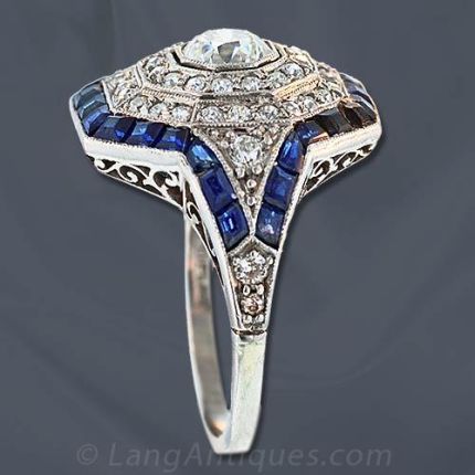 This delicate platinum ring shows the transition from Edwardian into Art Deco. A central European cut diamond (.60 carat, E-F color, VS2 clarity) is set into an octagonal setting and embraced by rows of bead set old mine cut diamonds (46 total, .75 carat total weight, E-G color, VS-SI clarity) and accented by a channel set calibre cut sapphire (1.50 carats total weight) border set atop a fine hand pierced scroll motif gallery.