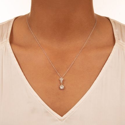 A lovely light-filled diamond pendant with a delightful flourish. This elegant Edwardian-era jewel shines brightly with a .77 old mine-cut diamond that connects to a tulip-like bail glittering with rose and old mine-cut diamonds, all of which suspend from a fine 18-inch platinum chain. Because more sparkle is always better, we have matching earrings: 20-1-12301. Total diamond weight, 1.05 carats. Hand fabricated in platinum over 18K gold, circa early-20th century.