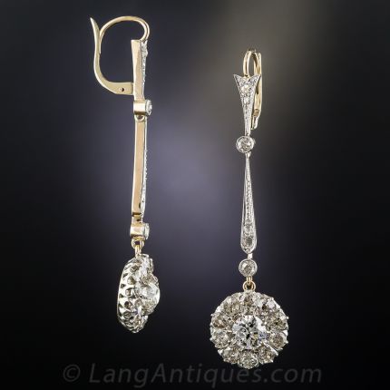 Just shy of 2 inches long, these swinging sparklers, crafted in platinum over 18K gold, date back to the early twentieth century. A bright and sparkling pair of European-cut diamonds, together weighing one-and-a-third carats, fill the centers of glittering diamonds halos, all of which anchor slender diamond-set pendants. 3.50 carats total diamond weight.