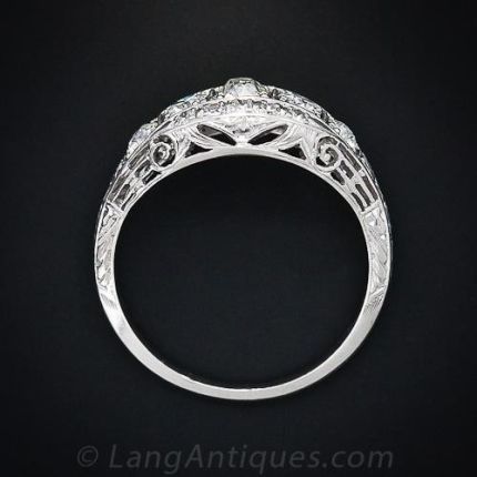 This is a perfect right hand ring to compliment your vintage engagement ring or an easy to wear low profile engagement ring as well. Five European-cut diamonds are set across the top of the ring in square bead settings atop hand pierced openwork details finished with engraved details along the shank. This antique, gently domed, low profile ring is comfortable and easy to wear.
