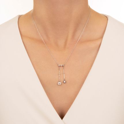 This elegant Edwardian-era negligee necklace, dating back to the first or second decade of the twentieth century, shines with a pair of lively icy-white European-cut diamonds set in millegrain-edged bezels, one of them floating inside an understated outer halo. The sparkling duo, dangling beneath a stylized diamond-set bow, via sleek knife-edge wires accented with single and rose-cut diamonds, will add lovely, low-key early 20th-century flair to your neckline. Dreamy. Total diamond weight, 1.12 carats. Hand fabricated in platinum over 14K gold. Platinum chain measures 16 inches.