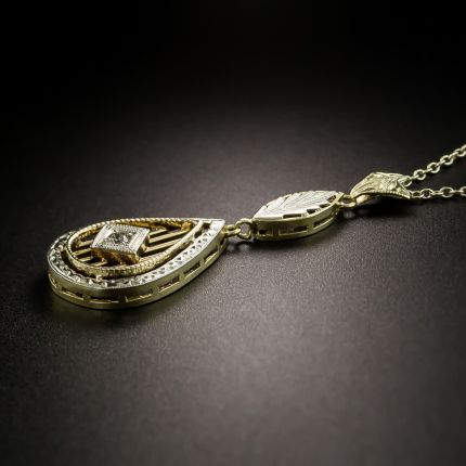 A lovely trio of shapes creates the graceful lines of this charming Edwardian pendant necklace. An engraved open pear-shaped frame centers a single twinkling European-cut diamond in a triple millegrain-edged setting backed by lyre-styled piercing. The pendant connects to an ornamental leaf, which in turn suspends from a decorative bail. Hand fabricated in platinum over 14K gold, it measures 7/16-inch wide and 1 1/2 inches long, with a 17-inch chain.