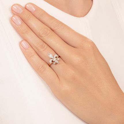 Used in the coat of arms of many monarchs, especially by the French monarchy prior to the French Revolution, the fleur-de-lys is a decoration in the form of a stylized lily flower, and is an enduring popular design motif. The one in this ring glitters with old mine and single-cut diamonds, plus one larger old mine-cut, all supported by a brightly burnished gold shank. A sparkling flourish for your finger. Total diamond weight, .57 carats. Hand fabricated in platinum over 14K gold, circa 1910, it is currently ring size 5 3/4.
