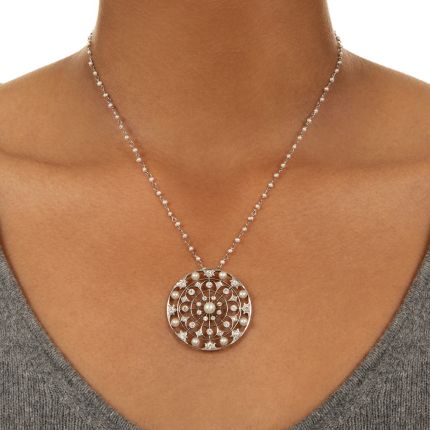 Evocative of a stained glass window in design, this openwork Edwardian beauty sparkles throughout with lively European- and Swiss-cut diamonds and gleams with lustrous natural pearls. Formerly a brooch, the lacy confection now suspends from an 18-inch wire-wrap chain of tiny free-form natural pearls. Sublime. Total diamond weight, 1.00 carat. Hand fabricated in platinum.