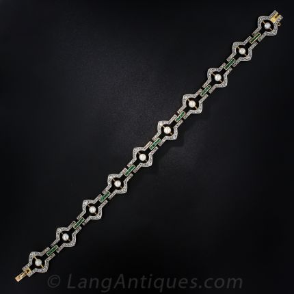 An utterly charming jewel from the turn-of-the-last century (circa 1900), this exquisite antique bracelet is masterfully hand-crafted of tiny rose-cut diamonds, glowing calibre emeralds and shimmering natural pearls set in platinum over 18 karat yellow gold. A delicate, refined Edwardian-era treasure. The bracelet measures 7 1/2 inches long by 1/2 inch wide.