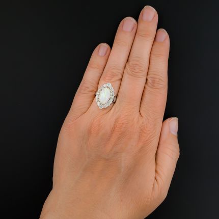 Hand fabricated in platinum over 14K yellow gold, this classic Edwardian (early-20th-century) jewel highlights a glowing oval white opal suffused with a kaleidoscopic play of electric pastel orange, green and violet colored flashes. The enchanting gemstone centers a navette-shaped frame composed of 16 small sparkling white European-cut diamonds together weighing 1.00 carat. Hand engraved fan motif shoulders add the finishing touch to this classic jewel. 13/16 inch. Currently ring size 5 1/2. Condition Note: Opal shows minor crazing.