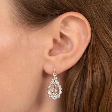 Hand fabricated in silver over 9ct. gold (hence of British origin), around the turn-of-the-20th-century, these classic late-Victorian/early-Edwardian earrings sparkle up and down and all around with a scintillating array of gently graduated European-cut diamonds encompassing a central pear shape and cushion-cut diamond drop. Forever earrings. 1 inch long (they drop a bit further from the ear wires). 2.28 carats total diamond weight.