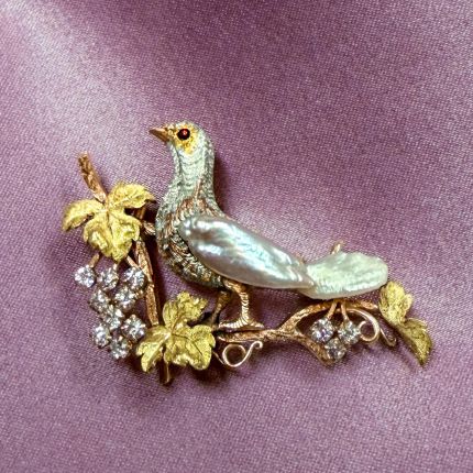 The finest and most passionate artists give extraordinary attention to every detail of their work. This utterly delightful brooch is a representation of such heightened artistry. A little bird, with a bright garnet eye, is realistically hand fabricated in gold with engraved feathers and, fittingly fashioned with freshwater natural wing pearls for its wings and tail. He rests upon a branch bearing textured gold leaves and brightly sparkling European and Swiss-cut diamonds, and is ready for display on your ensemble. A miniature masterpiece - circa 1900. Total diamond weight, .38 carat. Hand fabricated in 18K green gold (leaves) and 14K rose gold.