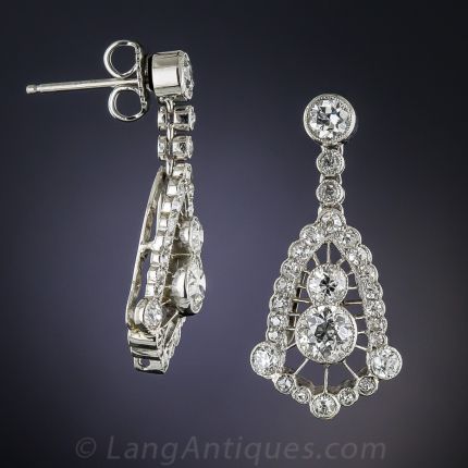 Ring in special occasions with these fabulous Edwardian/early-Art Deco stylized bell shape earrings beautifully hand-fabricated in platinum during the early-20th century. The curvaceous open work bottoms swing, sway and sparkle below trios of collet-set diamonds and chime loud and clear in the center with larger pairs of bright white sparkling European-cut diamonds outlined with small glittering diamonds. These one-inch long ravishing vintage rarities contain 2.00 carats total diamond weight.
