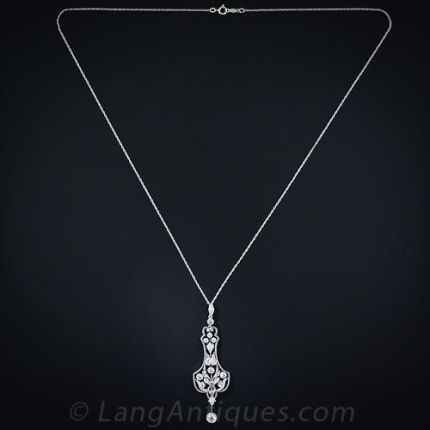 An enchanting platinum pendant, circa 1900, with a graceful curvaceous outline framing a stylized bouquet of sizzling diamonds. This feminine Edwardian treasure measures 2 1/4 inches long from the top of the diamond set bail to the bottom of the dangling European-cut diamond. This piece includes a delicate, 18 inch, 10 karat white gold chain, if you prefer a platinum chain we can find one for you at an additional charge.