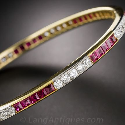 This exquisite bracelet, expertly handcrafted in platinum over 18 karat yellow gold, dates back to the first or second decade of the last century. The beautiful bangle glistens all around with alternating rows of perfectly matched, vibrant crystalline red, square-cut rubies and bright-white and sparkling European-cut diamonds with crisp hand a jour settings. The brilliant rubies are most assuredly from the legendary Mogok mine of old Burma. A fine and fabulous antique bracelet in virtually 'like new' condition. Total diamond weight, 3.20 carats; total ruby weight, 5.60 carats.