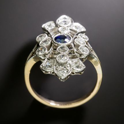 Sweeping curves and angular geometric shapes work in concert to create the distinctive form of this elegant Edwardian dinner ring. Its long and lovely (1 1/8 inches) openwork design shines throughout with 16 European-cut diamonds and is brightened by a single pop of color courtesy of a glimmering .40-carat royal-blue sapphire. It's like a sparkling celebration for your finger. Total diamond weight, 1.00 carat. Hand fabricated in platinum (top), 14K yellow gold (split shoulders), and 18K yellow gold (newer shank). Circa 1910-1915. Currently ring size 6 1/2.