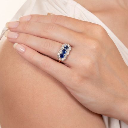 Dating from the first or second decade of the last century, this classic Edwardian-era jewel, lightly hand-fabricated in platinum over 18K, features a vibrant trio of glimmering cobalt blue sapphires (total weight, 1.58 carats). The oval-shaped top, outlined with a scalloped border of bright white European-cut diamonds, gently curves snugly over the finger and leads to a slender fluted ring shank. Total diamond weight, 1.00 carat. Currently ring size 6 1/4+.