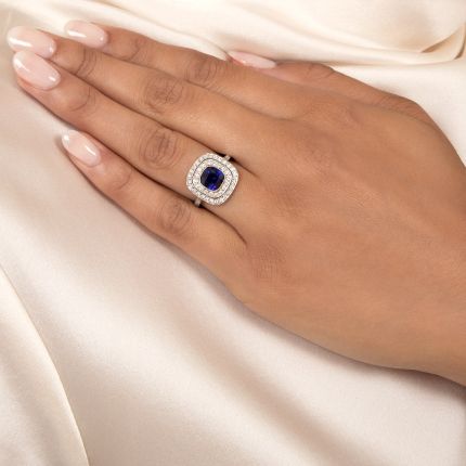 An intense 2.60 carat cobalt-blue cushion-cut Ceylon sapphire gleams from within glittering double halos composed of modern European-cut diamonds which continue along the shoulders of this delightful Edwardian-style delicacy, while a lacy under gallery adds a finishing flourish. A regal and timeless beauty. Hand-fabricated in platinum. Accompanied by a gemological report from the GIA stating: Heated. Sri Lanka (Ceylon) origin. Currently ring size 6 3/4.
