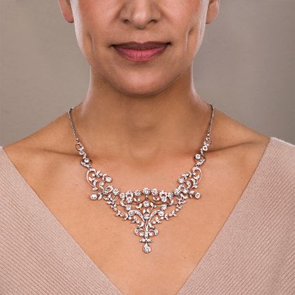 A breathtaking bouquet of bright white old mine-cut diamonds and swiss-cut diamonds, together weighing 15 carats, form the ultra-sparkling centerpiece of this strikingly stunning showstopper crafted in rhodium plated 14K gold (on top) and yellow gold on the reverse. Most likely dating back to the first half of the 20th century, the open feminine design clearly evokes Edwardian era splendor and refinement. A fabulous and impressive vintage necklace suitable for the fanciest of affairs.