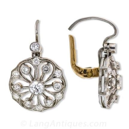 Darling diamond drop earrings that dangle ever so slightly from the ear are crafted in platinum in the Edwardian style and set with round brilliant cut diamonds that twinkle with every movement. The Diamonds are described as follows:Twenty Eight Round Brilliant Cut DiamondsWeight: .50 carat total weightColor: H-IClarity: SI-I1