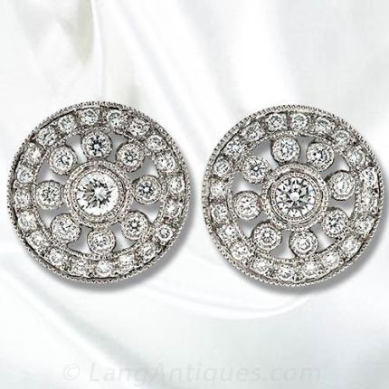 Platinum Edwardian style diamond earrings set with round brilliant cut diamonds (54 total, .35 carat total weight, F-G color, VS clarity) in a floral motif design. Earrings measure 3/8.