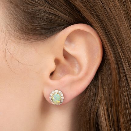 Crafted in platinum over 18K yellow gold in classic, timeless early-20th century Edwardian style, these cheerful jewels for your ears glisten and glow with luminous opals presenting confetti-like pastel colors, each encircled by small bright white and sparkling modern European-cut diamonds. What's not to love? Total opal weight - 1.00 carat, total diamond weight - .50 carat. They measure just a smidgen shy of a half-inch by 3/8 inch.