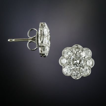 If you want a bigger look in diamond stud earrings, clusters are the way to go. This lovely pair, hand fabricated in classic Edwardian style, sparkles brightly with round brilliant-cut center diamonds (together weighing .60 carat), surrounded by smaller round brilliants. Shine on! Total diamond weight, 2.20 carats. In platinum, they measure 1/2 inch in diameter.