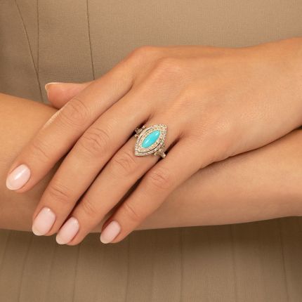 Such a heavenly color deserves two halos. Surrounded by double navette-shaped halos frosted with glinting rose-cut diamonds, a gleaming .80-carat marquise-shaped turquoise in a textured yellow gold bezel is imbued with a glorious azure hue and supported by fancy flared diamond-set shoulders that lead to a sleek fluted shank. Scrolls decorate the side gallery, adding a finishing flourish. Divine. Total diamond weight, .65 carat. Hand fabricated in platinum and 18K yellow gold, it is currently ring size 5 1/4.