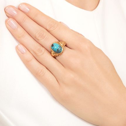 More than just diamonds and geometric shapes, Art Deco jewelry was also influenced by exciting new archeological discoveries in the Valley of the Kings in Egypt, and this arresting ring is an intriguing representation of that influence. Crafted in 14K gold by Newark, New Jersey jeweler Jones & Woodland (who also created jewelry for Tiffany & Co.), it features an oval cabochon turquoise with a striking matrix, supported by shoulders carved with Egyptian pharaohs. The side gallery depicts salamanders symbolizing the god of the sun, Ra, and ibis birds, which represent Thoth, the god of wisdom, the moon, and magic. History—and magic—for the wearing. Currently ring size 7 1/2.