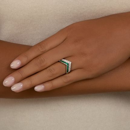 The chevron shape is often used to represent rank or length of service in the military. In this chic estate ring it represents a striking design of sparkle and color, courtesy of 11 bright white round brilliant-cut diamonds and 14 glimmering deep green calibre emeralds. At your service. Total diamond weight - .45 carat, total emerald weight - .50 carat. In platinum, currently ring size 6 3/4.