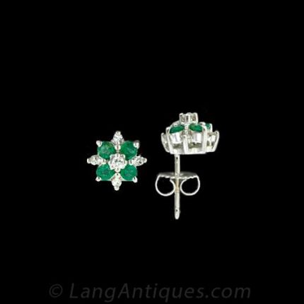 Cute 14 karat white gold emerald and diamond cluster stud earrings.