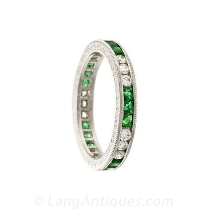 Platinum antique style alternating three by three vibrant emerald and diamond eternity band finished with milgrain details and engraved scroll motif. This band is a size 6. The Gemstones are described as follows:Fifteen Round Brilliant Cut Diamonds Weight: .55 carat total weight Color: G-H Clarity: SI Fifteen Square Cut Emeralds Weight: 1.05 carat total weight