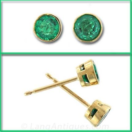 18K Yellow gold bezel set emerald stud earrings featuring bright green emeralds with a total weight of .55 carat.