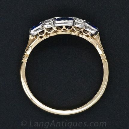 Newly crafted in London, this refined, five-section ring features velvety, royal-blue sapphires alternating with bright-white mine-cut diamonds in timelessly beautiful late Edwardian/early Art Deco style. Crafted in crisp platinum and rich 18 karat gold, with a lacy open gallery and delicate milgrain engraving. Exquisite! In a finger size 7, stamped with English hallmarks.
