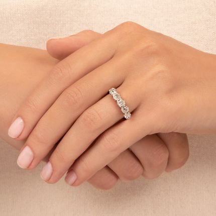 It's oh so simple! A captivating quintet of bright-white old mine-cut diamonds, together weighing 1.00 carat, sparkle shoulder-to-shoulder across your finger in this classic band ring, hand fabricated in platinum over 18K yellow gold, from the early 20th-century (Edwardian) Great Britain. Currently ring size 4 3/4.