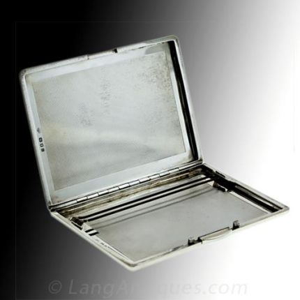 Catch the pheasants while you can! This elegant sterling silver cigarette case features two pheasants, flushed out of their hiding places and in flight. The entire case is embellished with fine engine-turned engraving. The case was made by Goldsmiths and Silversmiths Co. Ltd in England between 1938-9 and has the stamps to prove it. Measurements: 3 1/4 X 4 1/2. The case can also be used as a carrying case for money and credit cards.