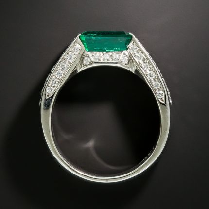 A gorgeous, glistening, crystalline green, elegantly elongated emerald-cut emerald, weighing 1.48 carats, glistens and glows horizontally between sparkling pavé-set diamond shoulders in this sleek, chic, and stunning estate jewel rendered in gleaming platinum. .65 carat total diamond weight. Currently ring size 6 3/4 with limited resizing.