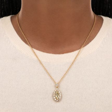 Ah, the marvelous marquise. In this dazzling estate pendant, an elongated 1.59 carat stone, tinged with a touch of natural sunshine, sparkles brightly from within a surround of small round brilliant cut-diamonds and suspends from a cool rolo chain by way of, yes, another marquise diamond. Maximum sparkle at your service for a minimal (bargain) price. Total diamond weight, 3.45 carats. Hand fabricated in 18K gold. Chain adjusts to 17 3/4 inches.