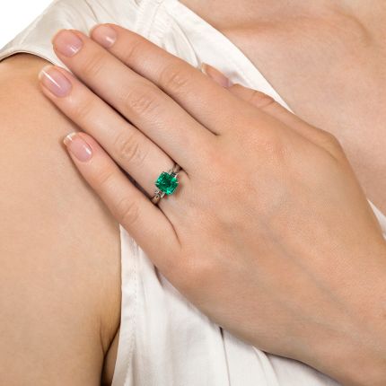 In this classic estate jewel, a truly gemmy, gorgeous, emerald-cut Colombian emerald, weighing .55 carat, casts a vibrant richly saturated green glow between a pair of icy-white mirror-like baguette diamonds (together weighing .19 carat). Hand fabricated in luminous platinum. Currently ring size 5 3/4+.