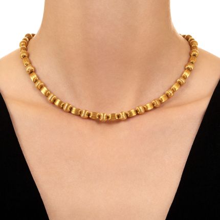 Gold. It has a warm, gleaming presence like no other metal, and the gold beads in this indisputably chic estate necklace are particularly eye-catching. Alternating in round and oval shapes, each one is fluted, creating tactile texture and a luster that forms a circle of golden light to grace your neck. Crafted in 14K yellow gold, the beads are strung on a 16 1/2-inch foxtail chain (metal undetermined).