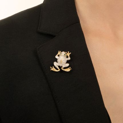 This lively leaper has had it with lily pads. Aglitter with super sparkling round brilliant-cut diamonds, his bright green emerald eyes are surveying the scene for a new home--somewhere on you! Total diamond weight, .75 carat. Crafted in 18K yellow gold (the diamond area is rhodium plated).