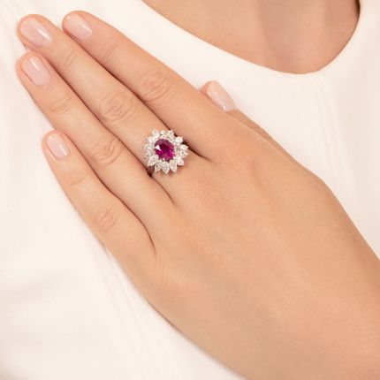 A study in sparkle and color, this festive estate ring glows at its center with a gorgeous 2.19 carat oval electric raspberry-red Burmese ruby presented in an undulating, petal-like surround of icy-white marquise and round brilliant-cut diamonds. A cool asymmetrical twist on a classic theme. Total diamond weight, 2.26 carats. Crafted in platinum, it is currently ring size 7. Condition note: ruby has eye-visible inclusions. GIA gemological report states: Burma (Myanmar) origin; Heated (minor residues).