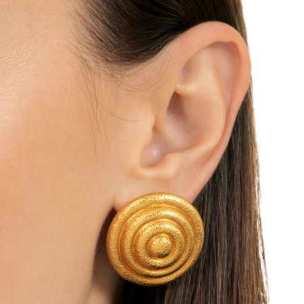 Graphic art for your ears. Big, bold, textured gold spiral disks make a strong face-framing statement that's just as stunning with your black turtleneck as with your Audrey Hepburn-esque little black dress. Substantially crafted (just shy of 21 grams) in 22K yellow gold (post and clip backs are 18K gold).