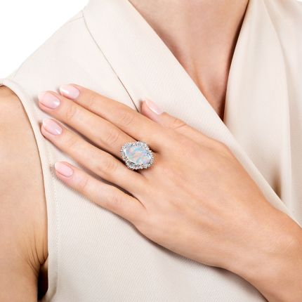 An elegantly elongated translucent opal, imbued with a rainbow pallet of electric pastel colors, shimmers, glistens and glows from every angle between fans of gleaming tapered baguette diamonds and crescents of small sparkling round brilliant-cut diamonds in this strikingly stunning cocktail bauble crafted in platinum. 7/8 inch. Currently ring size 5 3/4.