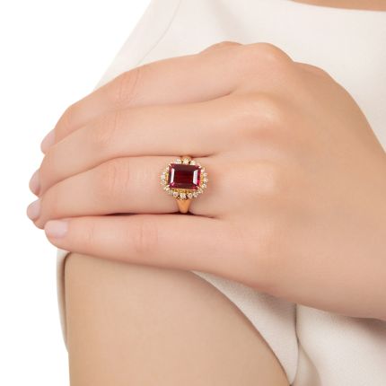 A thoroughly enchanting gemstone, a 3.43 carat emerald cut tourmaline (a.k.a. rubellite), is suffused with a fiery, crystalline, raspberry red glow, and is elegantly and tastefully presented in a frame of small sparkling white full-diamonds, in this jubilant estate jewel. Total diamond weight, .36 carat. Rendered in rich, gleaming 18K yellow gold. Currently ring size 5 1/2.