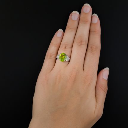 A bright, vibrant, richly saturated apple green faceted oval Peridot, weighing 3.97 carats, glistens and glows between sparkling diamond-set shoulders in this colorful and cheerful estate jewel rendered in gleaming 18K white gold. Currently ring size 6 3/4.