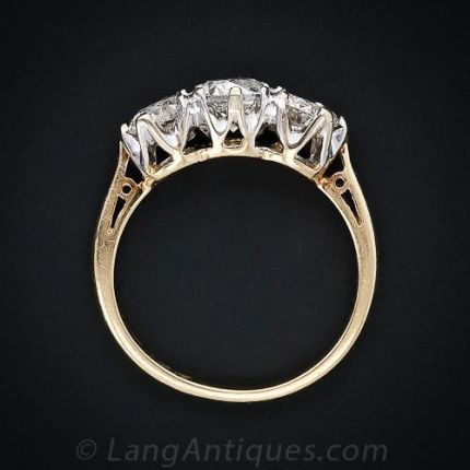 Forever a classic! This Victorian style three-stone diamond ring flashes with 1.85 carats of round brilliant cut diamonds. Six prong set, the diamonds are mounting in 18K white gold atop a highly polished 18K yellow gold knife-edge style ring.
