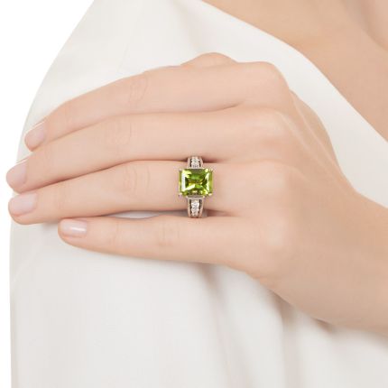 How perfect--something beautiful that keeps bad things at bay. In ancient times, it was believed the green gem, peridot, could dissolve enchantment and banish evil. And while you might not have any particularly malevolent forces at work in your life, it doesn't hurt to have the magnificent gem on hand--literally. Glistening at the center of this bright and bold ring is a 4.39 carat peridot that emanates a vibrant spring grass-green hue, and is buttressed by steeply sloping, slightly flared shoulders that sparkle with lively round brilliant-cut diamonds. Think of it as your ring of power and peace. Total diamond weight, .40 carat. In platinum, currently ring size 7. Condition note: peridot shows light wear.