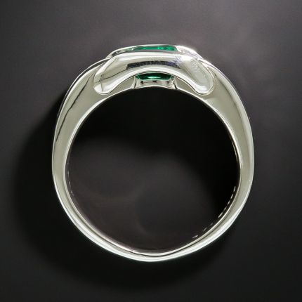 A vibrant green Colombian emerald (.43 carat) radiates between curved slender rows of gleaming baguette diamonds, seamlessly set in a sleekly designed modern platinum mounting that artfully--and practically--protects the emerald. Currently ring size 5 3/4.